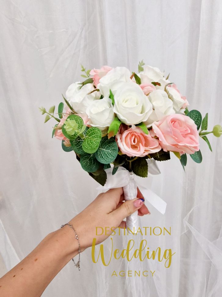 Булчински букет с розови и бели рози, зелен евкалипт е изработен с красиви изкуствени цветя и остава спомен завинаги. Подходящ за основен или втори булчински букет (за ритуала с хвърляне на букета). Завършен с детайли по ваш избор.