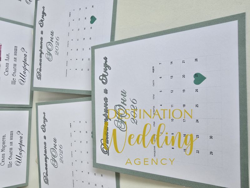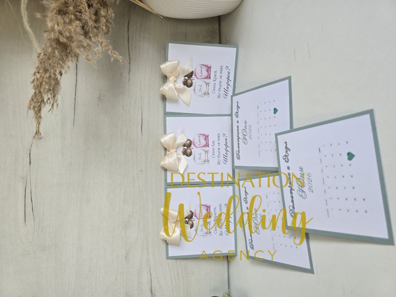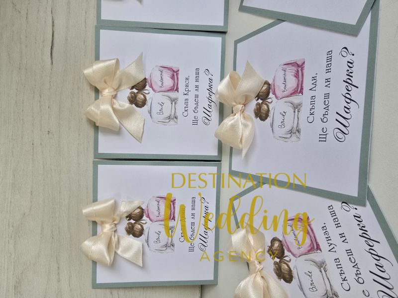 Поканете кумове или шаферите си с нежна покана в зелен дизайн, завършена с панделка в цвят по ваш избор. Оставете датата, имената на младоженците и името на шаферката/кумата в полето за коментар.