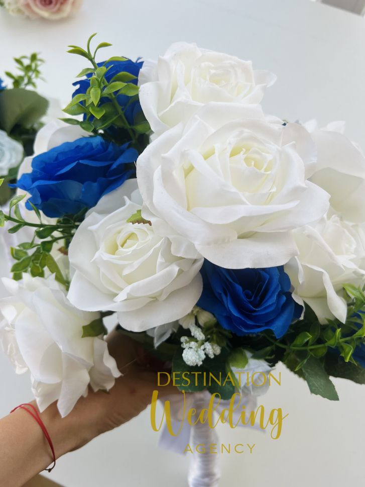 Булчински букет със сини и бели цветя е изработен с красиви изкуствени цветя и остава спомен завинаги. Подходящ за основен или втори булчински букет (за ритуала с хвърляне на букета). Завършен с детайли по ваш избор.