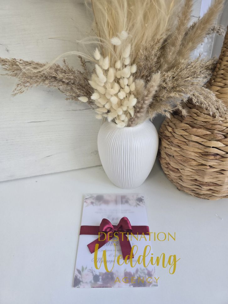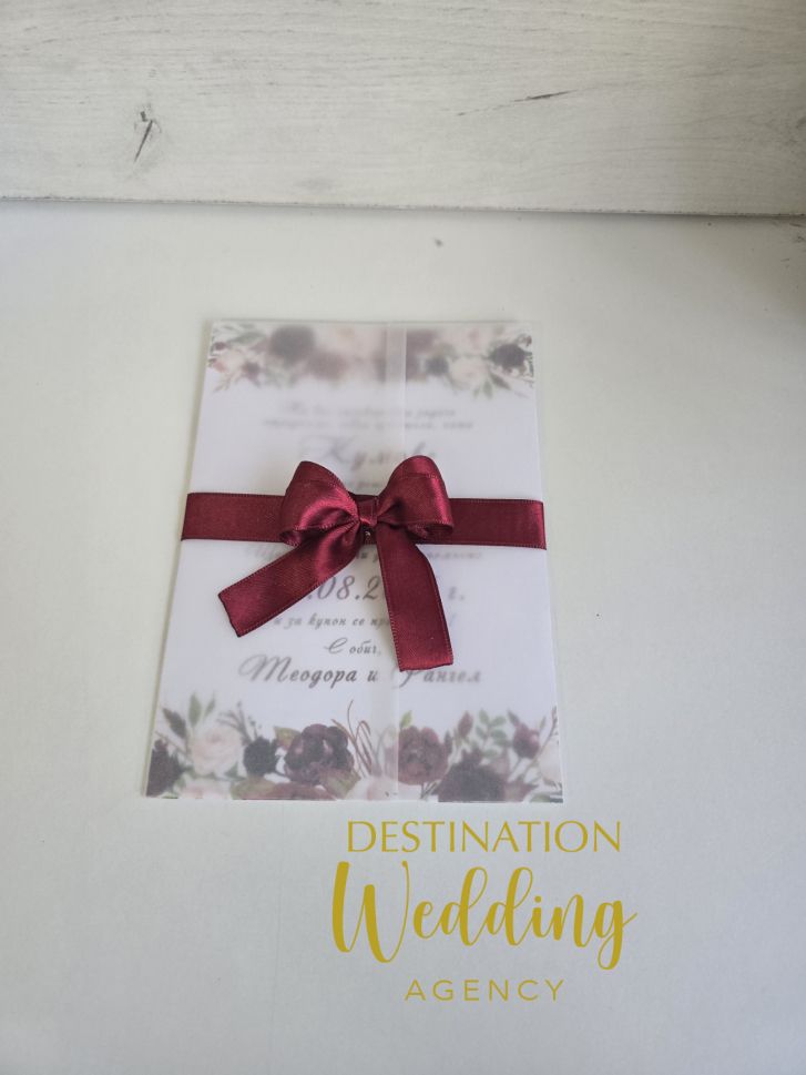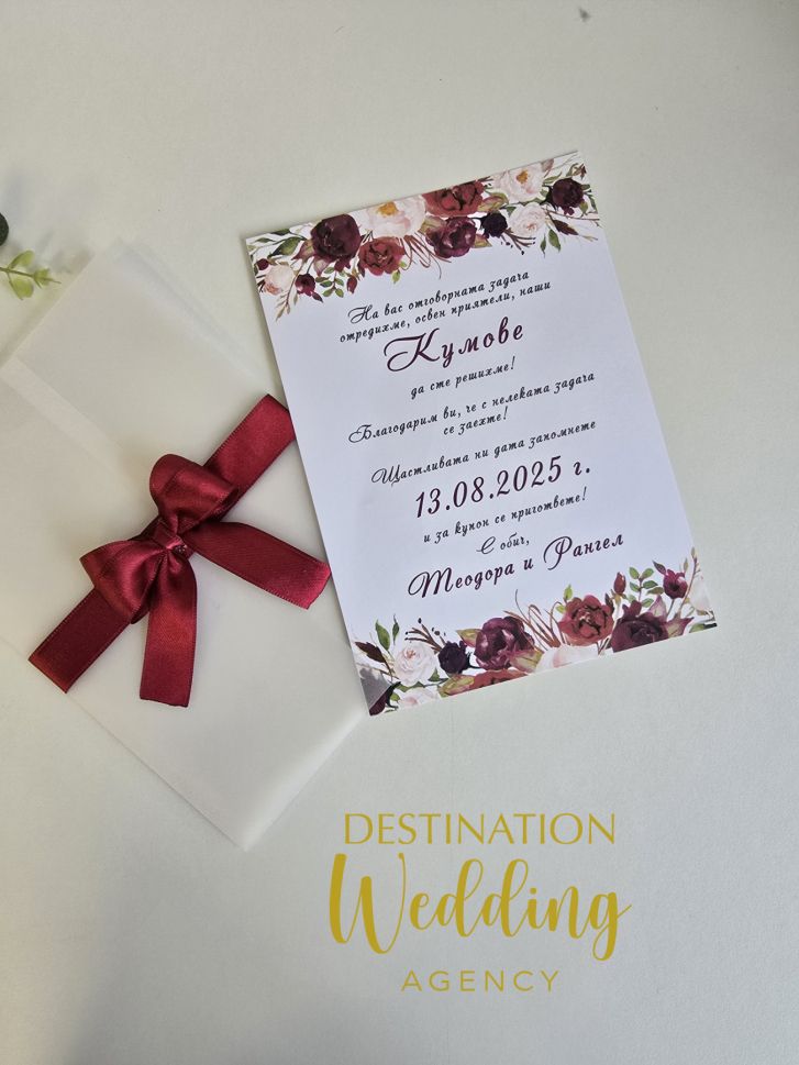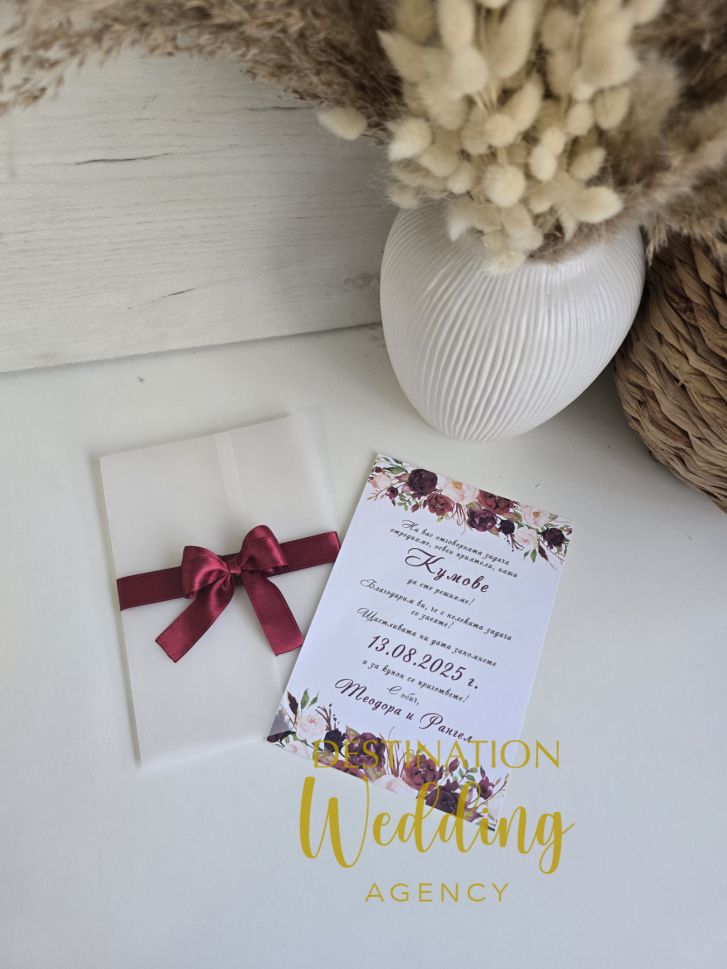 Поканете кумове или шаферите си с нежна покана в бордо дизайн, завършена с панделка в цвят по ваш избор. Оставете датата и вашите имена в полето за коментар.