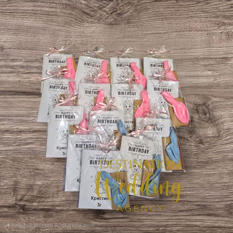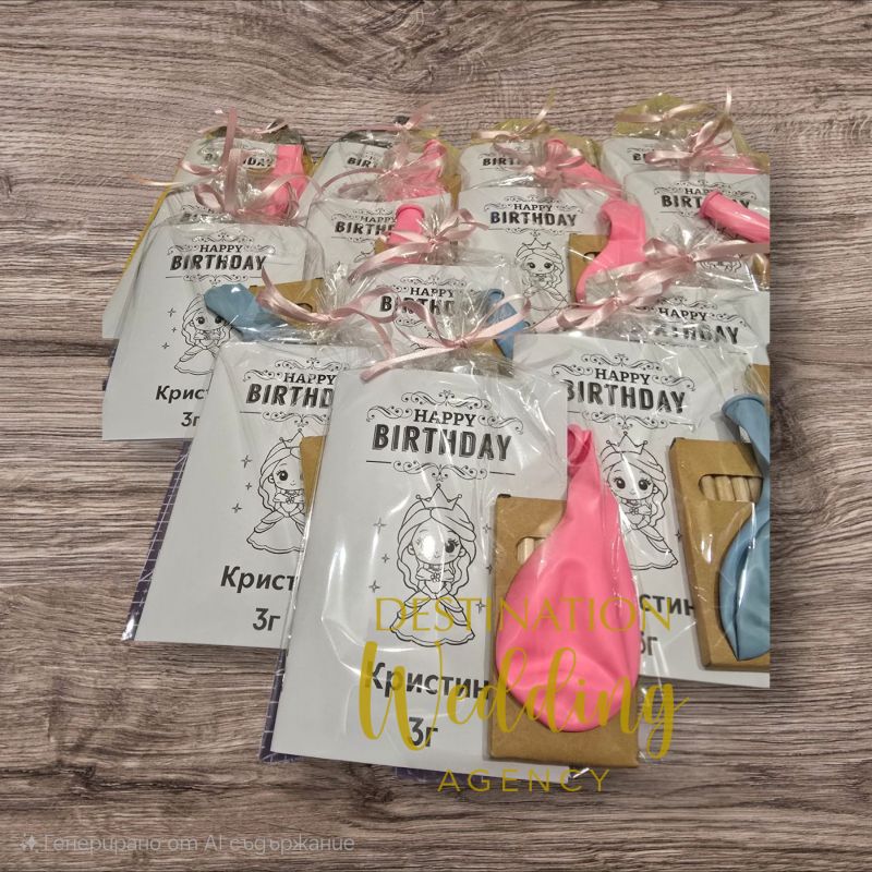 Направете детския празник още по-весел с нашите уникални подаръчета за гости! Всеки комплект съдържа: