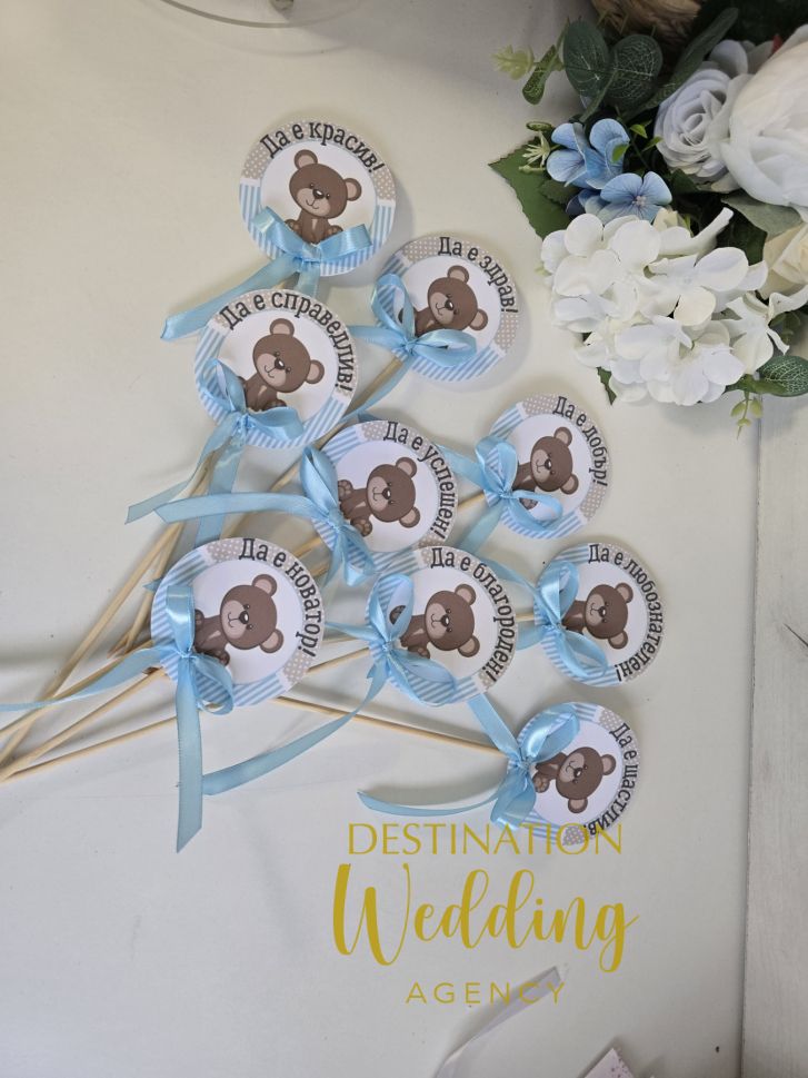 🎀 Всеки топер е изработен с внимание до последния детайл – симпатично мече, нежна цветова гама в синьо, фина сатенена панделка, и вдъхновяващо послание като „Да е добър!“, „Да е щастлив!“, „Да е благороден!“