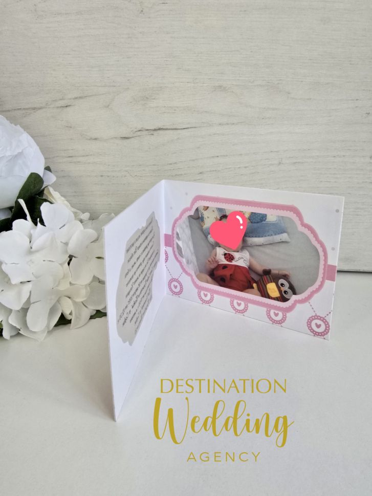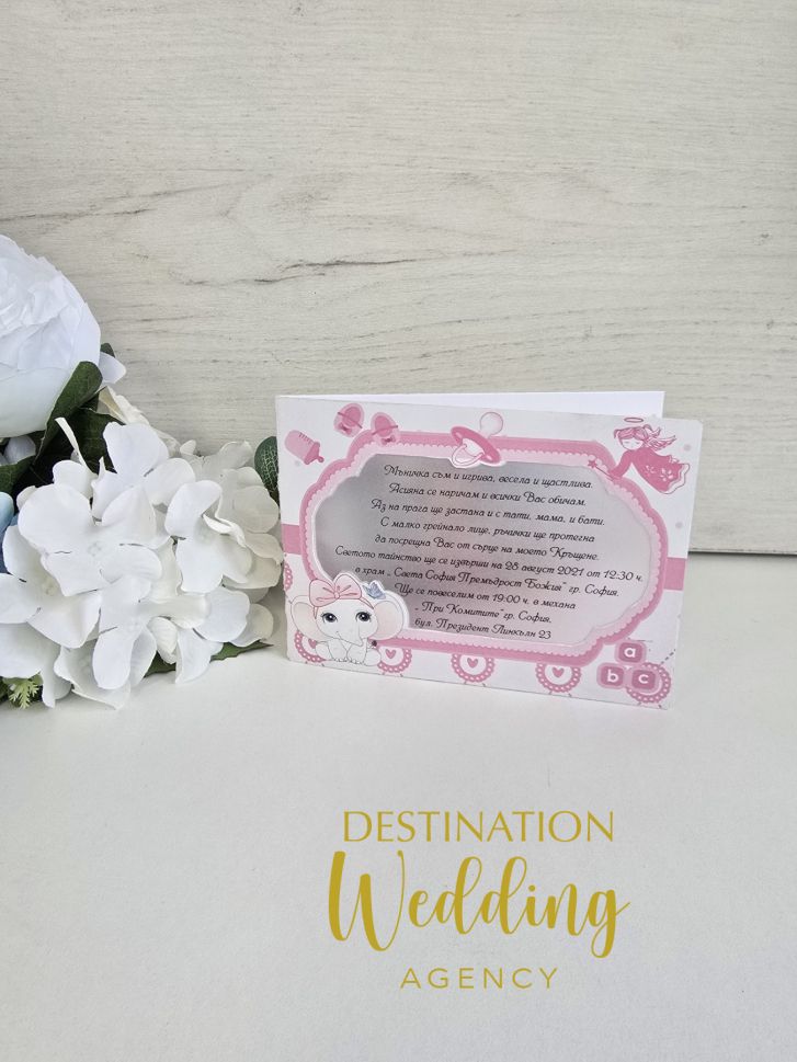 Комбинацията от ефирен паус, весел дизайн в розово и възможност за снимка на детето правят всяка покана уникална и лична.