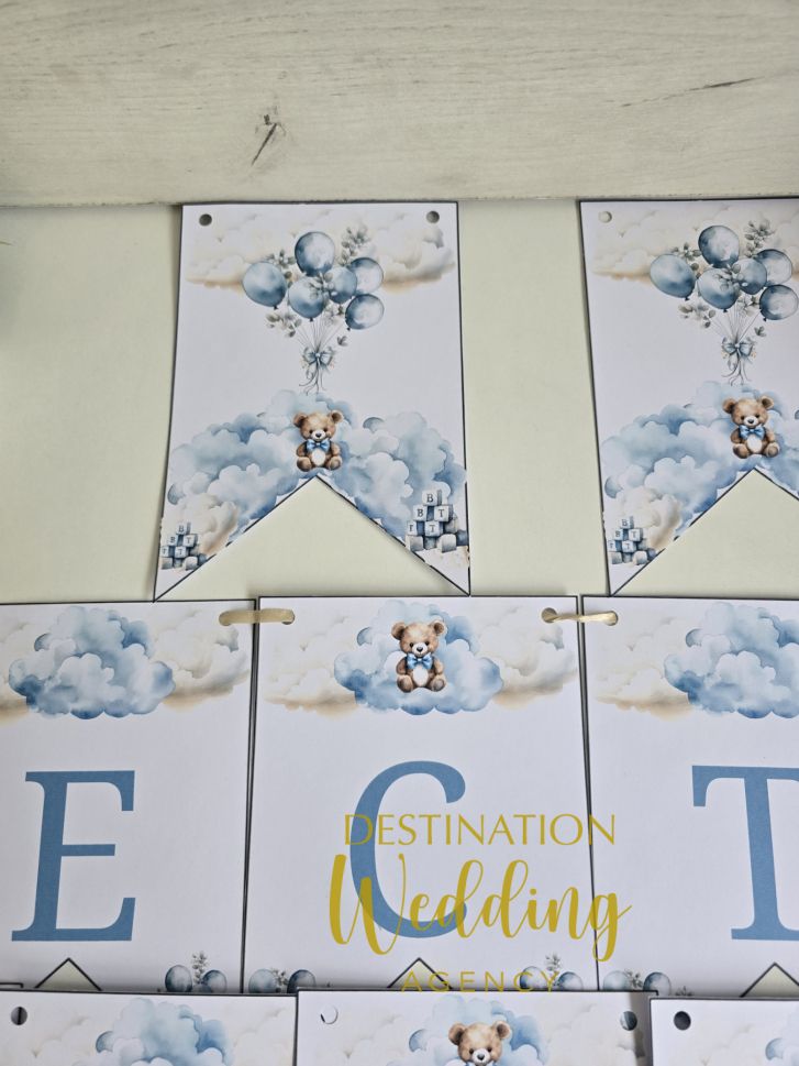 Банер „Честит рожден ден“ с мече и сини облачета