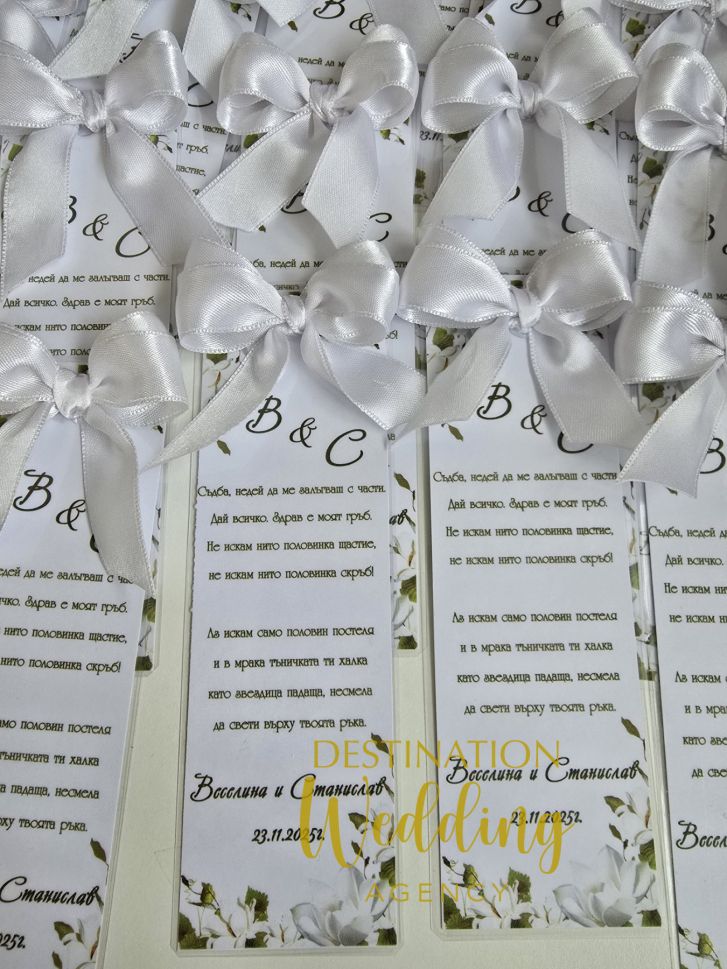 Подарете практичен спомен на своите гости от вашия голям ден – книгоразделител, персонализиран с вашите имена/дата/инициали и любовен цитат, фраза или друг ваш личен текст. Подаръкът е подходящ за гостите независимо от възраст и пол.