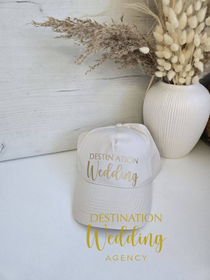 Бяла сватбена шапка със златен надпис „Destination Wedding“ – стилен аксесоар за булка, моминско парти, пътуване и сватбена фотосесия.
